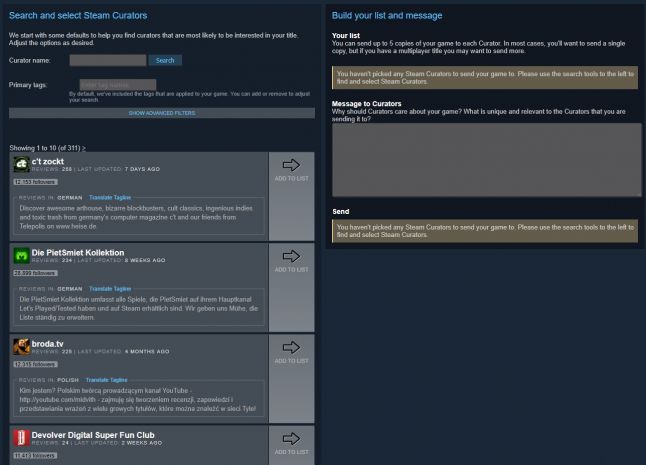 Nested under Marketing Tools and Data in Steam’s developer options, Curator Connect gives developers the ability to search for curators by name, operating system, language, or curator-specified tags. From there, they can verify a curator’s reach and identity through linked social accounts and add them a list of preferred Steam Curators.